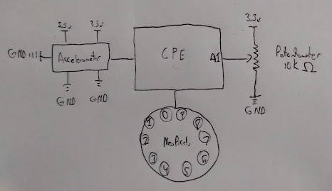 This is my game controller for Art of Rally. The conceptual model for the controller is based off the design of RC car controllers that uses a steering "wheel" and a trigger to move forward. A trigger is really just a different type of button, so instead I went with motion controls for controlling the acceleration and braking of the cars in-game. As such, this controller primarily uses the accelorometer on the CPE and a potentiometer hooked up to pin A1. I picked this as a conceptual model because even though Art of Rally has more realistic car physics and control than most other racing games, the perspective of the game and the graphics makes it look like you are playing with toy cars, or RC cars. As such, I figured what better way to control video game RC cars than with a RC video game controller.
