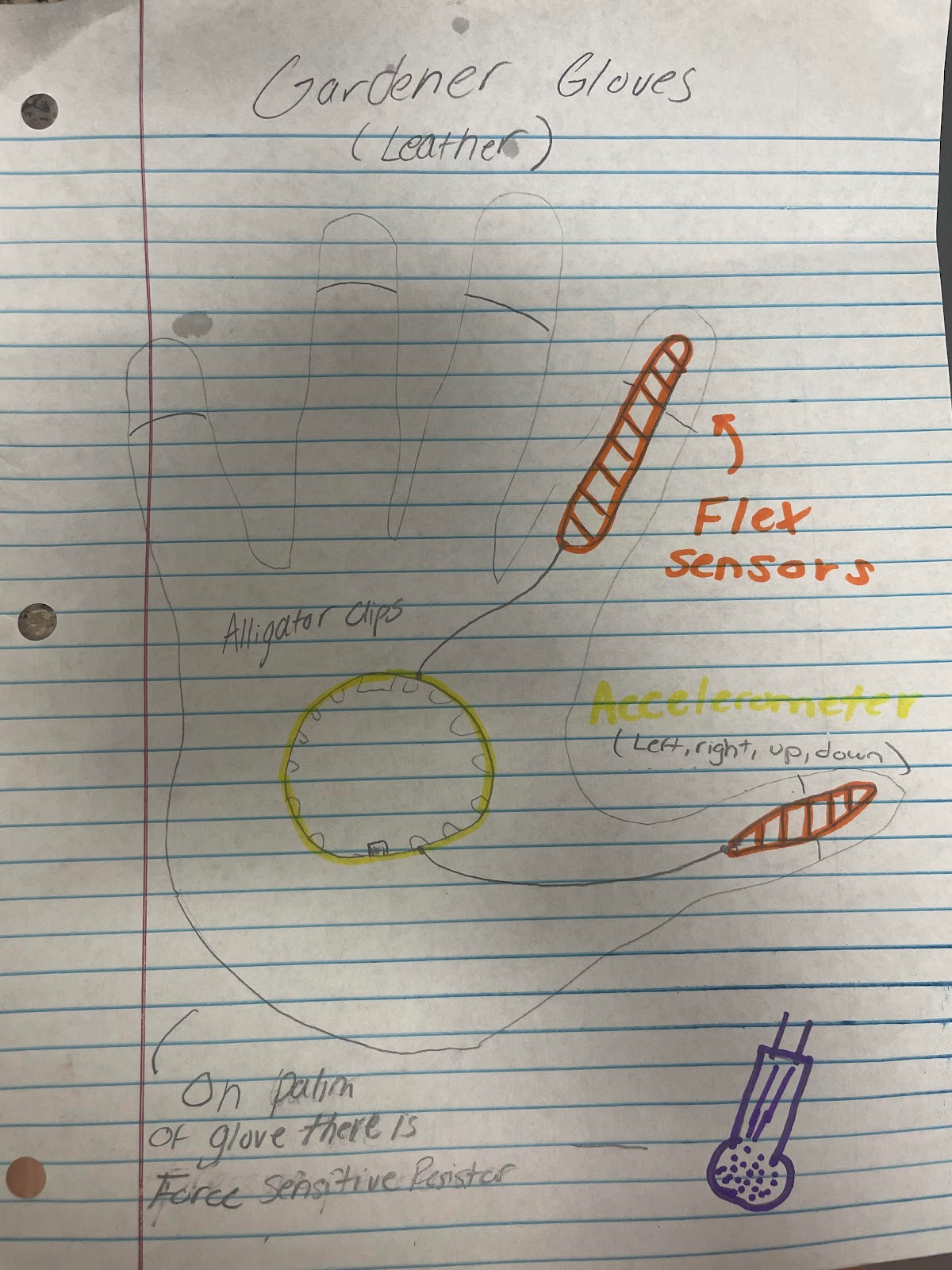 The glove controller I am making mimics gardening gestures for interactive controls for Plants vs Zombies and it just makes a lot of sense since it is an actual tool gardeners use in a game where you are technically planting plants. Tilting the hand scrolls the screen left, right, up and down, bend thumb cycles plants, bend index finger plant selected, and squeezing activates abilities. This makes the gameplay turn into the act of nurturing a garden. Plants vs Zombies is all about fighting off zombies with plants, so planting with a glove on makes perfect sense for the controller and game relationship. Slide potentiometer in the pseudo code is actually meant to be FSR resistor.