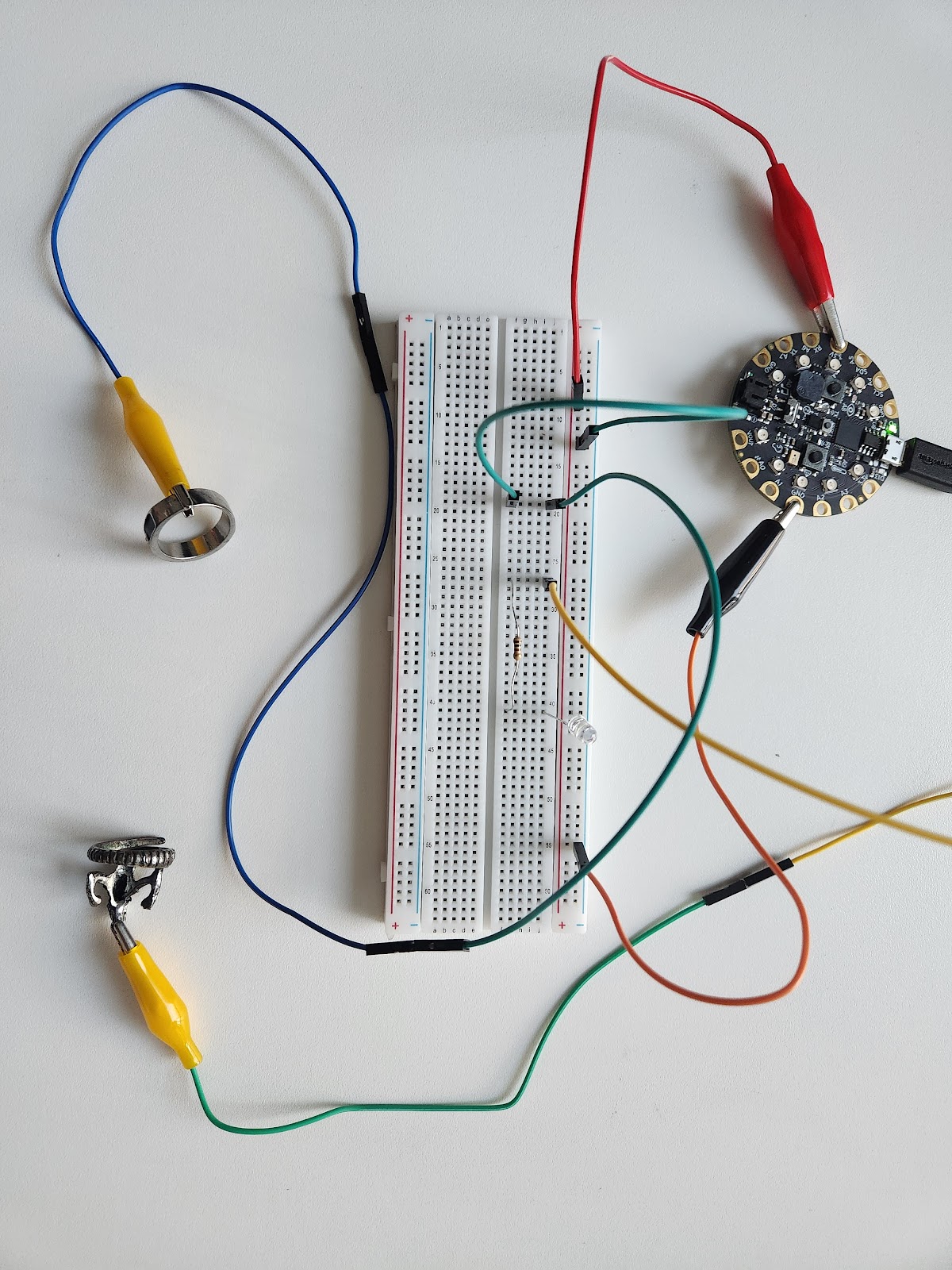 circuit when fastened. This action powers an LED light on a breadboard, with an